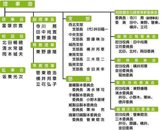 大阪府製本工業組合概要委員会の概要財政健全化経営革新委員会組合が抱える様々な問題に取組み業界の地位向上・組合事業の活性化を展望するとともに、財政健全化に取り組みます。 総務広報委員会通常総会、四役会、理事会の運営及び関連団体との調整をすると共に組合事務局の管理運営をおこないます。 財務委員会組合事業活動を円滑に推進するため、組合財政の健全化を推進するとともに、組合財産の保全をおこないます。 安全技術委員会製本機械に対する技術力を高めるため、各種機械技術(安全)セミナーの企画、運営をするとともに、機械を操作する上での安全操作に重点をおき、組合員企業の安全操業、生産性向上に重要な役割を担っております。 組織活性化委員会組織活性化の要である組合員増強運動を展開し、組合員同士の意思疎通、支部、部会への活性化の提言、各種分野での講演会、セミナーの開催に取り組み、時代に即した活性化施策に取り組んでおります。 組合組織図〈敬称略、順不同〉
