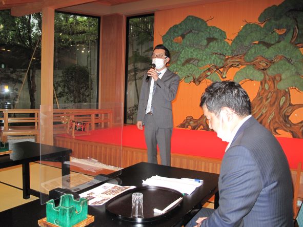コロナ禍により実施が遅れていた、巽功一氏(巽紙工梶A中田延宏氏(鞄研)と本年の卒会、佐々木隆弘氏(佐々木洋紙梶jに花束と記念品が贈られた。